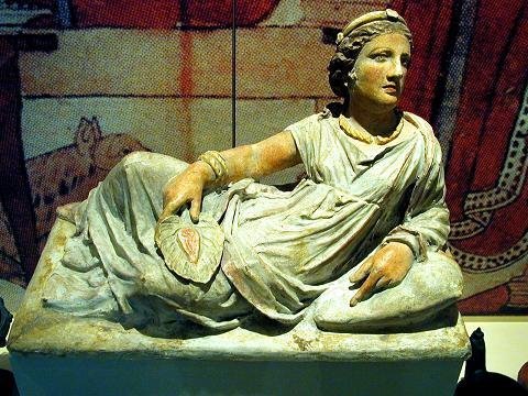 Supongo que contra los etruscos tenían que fueron sus enemigos en la península italiana durante los siglos VII y V a. C. y contras las etruscas pues que, al contrario que las otras grandes culturas del Mediterráneo, como Grecia o Roma, la mujer en el mundo etrusco tenía un estatus similar al varón, especialmente en las élites. En la sofisticada y aristocrática cultura etrusca encontramos mujeres que participan activamente en la vida pública y que disfrutan de una libertad y una condición social muy alejada de la de las esposas y madres griegas y romanas. Acompañaban a sus maridos a los saraos y banquetes en los que lucían vestidos de alta costura y disfrutaban de los caldos de la tierra. Podían ser dueñas de esclavos, titulares de bienes y actividades productivas, sus tumbas eran tan ricas como las de los varones y en las inscripciones funerarias se conservaban sus nombres y apellidos, algo que perdían las romanas y griegas, mujeres sin nombre que tomaban el de sus padres y maridos.