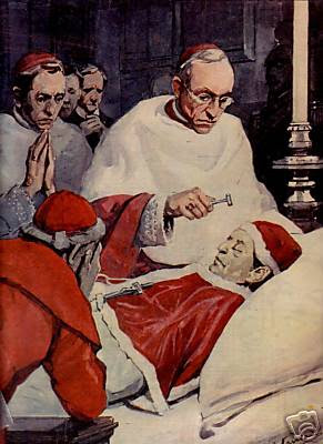 El Papa ha muerto. El camarlengo lo anunciará. Su anillo será destruido y su sello se romperá. Los aposentos papales se cerrarán y sellarán. Mientras las campanas siguen doblando, los restos del Pontífice serán entregados a los embalsamadores; así, su cadáver podrá ser objeto de veneración por los fieles. Se situará su cuerpo en la Capilla Sixtina rodeado de cirios mientras la guardia noble vela sus restos mortales bajo los frescos del Juicio Final del gran Miguel Ángel. Al tercer día, será enterrado revestido de gran pontificado: en la cabeza una mitra, un velo púrpura cubrirá su rostro y un manto de armiño le abrigará en la cripta. Será enterrado en tres féretros: uno de ciprés, de plomo el segundo para evitar la humedad y donde irá su acta de defunción, y el último de pino para ser así igual a los otros hombres que van a la tumba en caja de madera.