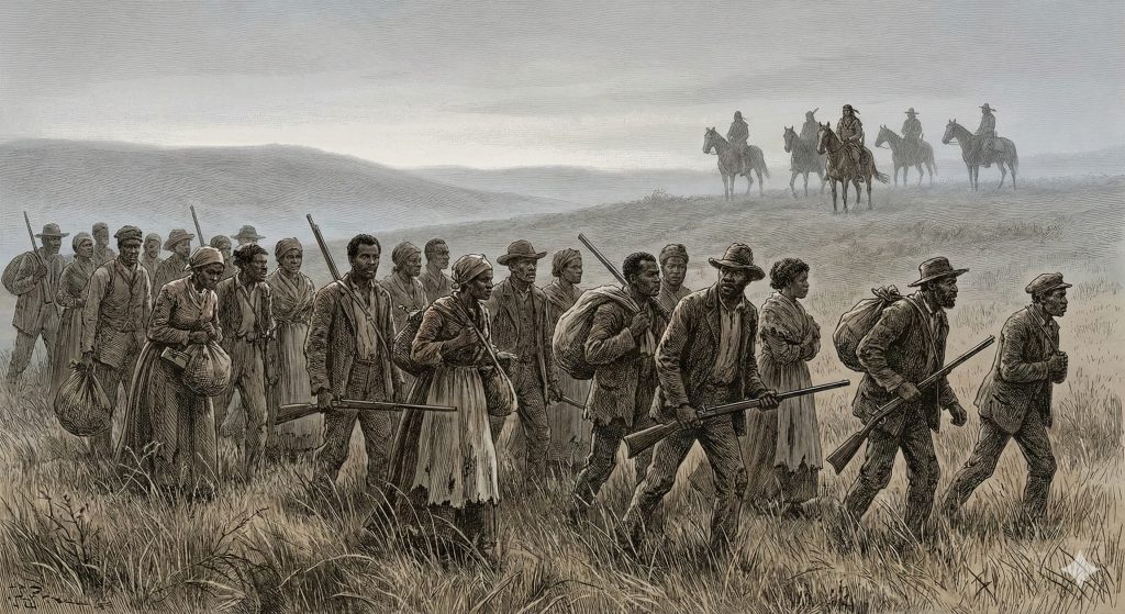 El 15 de noviembre de 1842 decenas de esclavos, la mayoría propiedad de la familia Vann y otros líderes tribales, decidieron que ya era suficiente. No fue una fuga improvisada; fue una operación perfectamente calculada. Encerraron a los capataces y dueños en sus propias casas mientras dormían, asegurando así una ventaja crucial de tiempo. El grupo asaltó el almacén y la herrería. Se llevaron rifles, municiones, caballos, mulas y provisiones. Sabían que el viaje sería largo y peligroso. Su destino no era el Norte abolicionista, que estaba demasiado lejos. Su tierra prometida era México, donde la esclavitud había sido abolida y donde sabían que encontrarían refugio si lograban cruzar la frontera. A medida que la columna de fugitivos avanzaba hacia el suroeste, su número crecía. Al pasar por las tierras de la nación Creek, se les unieron otros esclavos de familias prominentes, como los McIntosh y los Marshall.